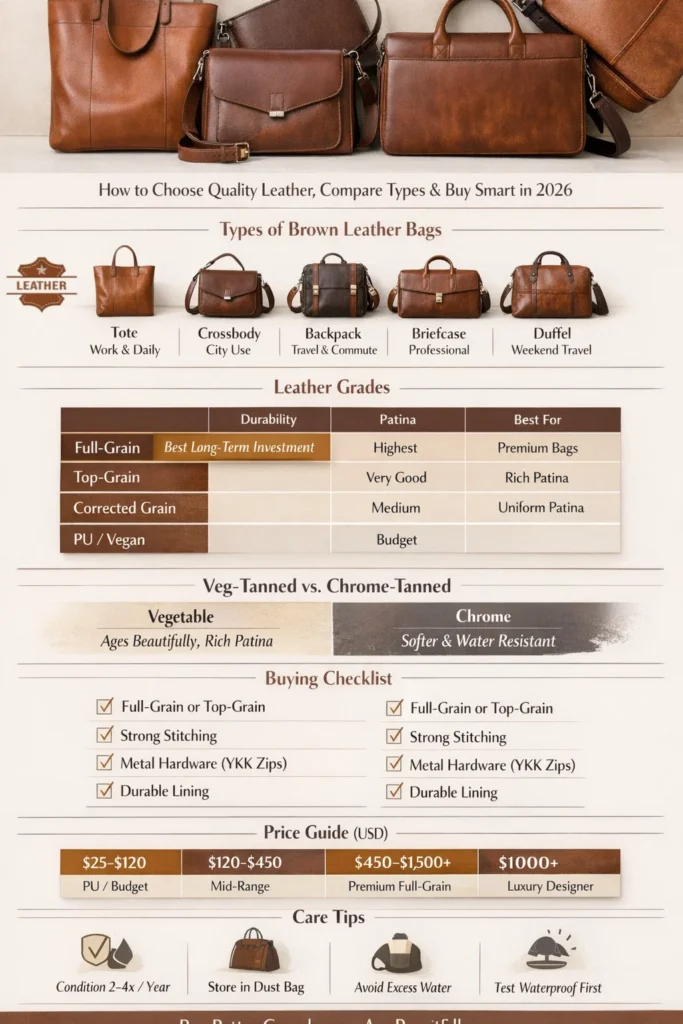 A brown leather bag is any primarily leather bag finished in brown tones (tan, cognac, chestnut, espresso). Key attributes include: