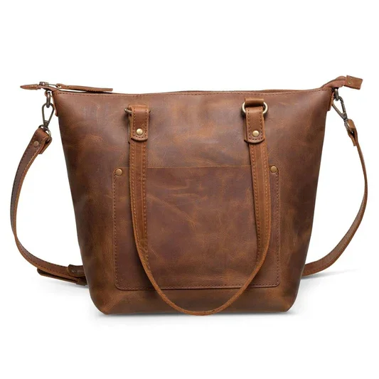 4. Vintage Distressed Tote (Pull-Up Leather) Features: Oily finish, rustic patina development. Best for: Creatives, photographers, and designers. Keywords: pull-up leather tote, distressed leather bag, vintage leather tote.