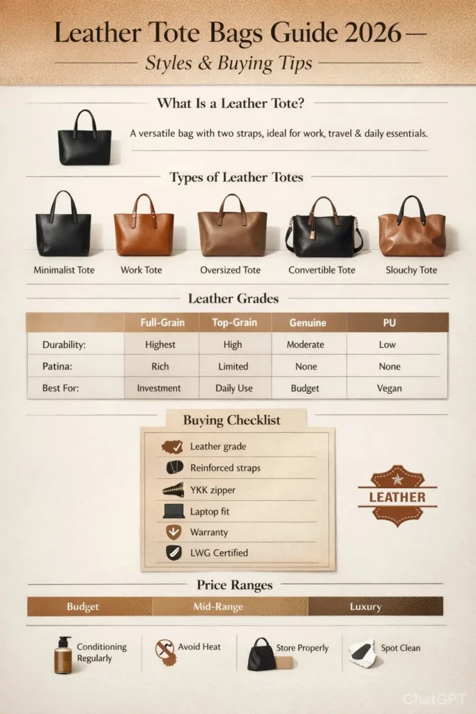 Leather Tote Bags remain a timeless, versatile essential in 2026—combining everyday practicality with refined style. Whether for work, errands, travel, or casual outings, a quality leather tote offers ample space, easy access, and lasting durability. This friendly, comprehensive guide covers styles, leather types, manufacturing insights, buying tips, care advice, price expectations, and more to help you choose confidently.